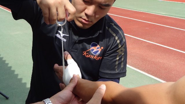 試合中のテーピング(時間が無い中、巻直し。)