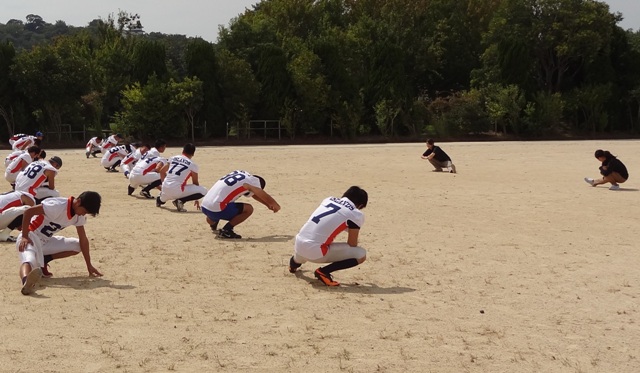 試合前のアップ(2人の学生が選手の前で行なっています。)